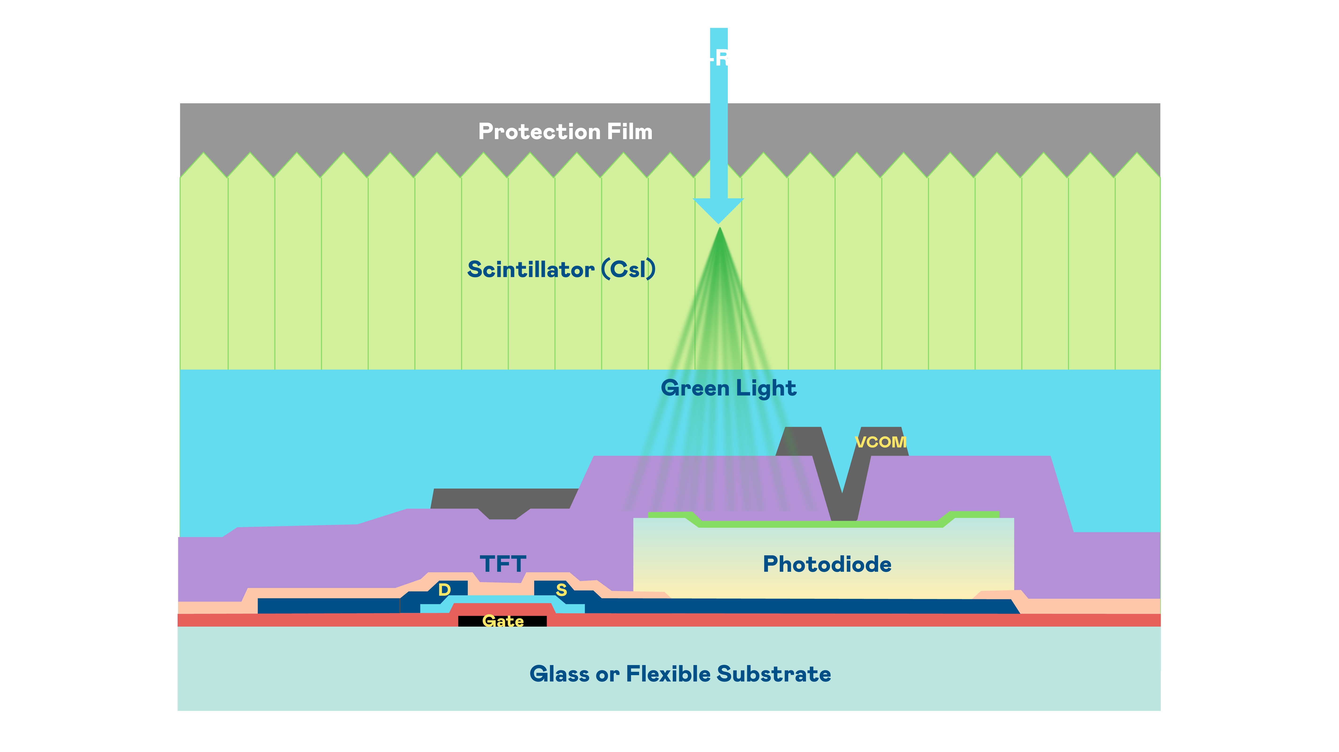 优发国际的X光影像感測陣列使用薄膜電晶體 (TFT) 作為每個像素的讀取開關,搭配光電二極體(Photodiode)的光電轉換元件,用以感測X光影像訊號。